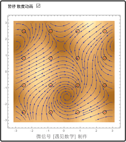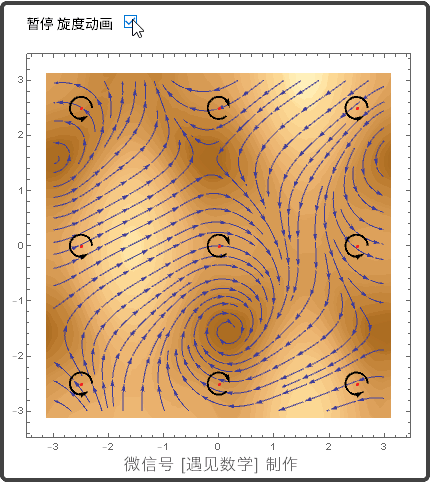 观察下面两个动图, 在向量场 F(x,y)=(Cos(y)-1. Sin(x)^3, -0.1 y-1. Sin(x)) 中取 9 个不同点处的旋度和散度的情况: