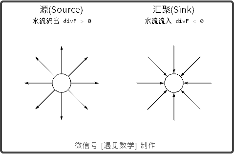 观察下图动画, 如果 Source 处散度为正, 则流体从源处流出, 如果为负, 则流进(或压缩)到该点处.