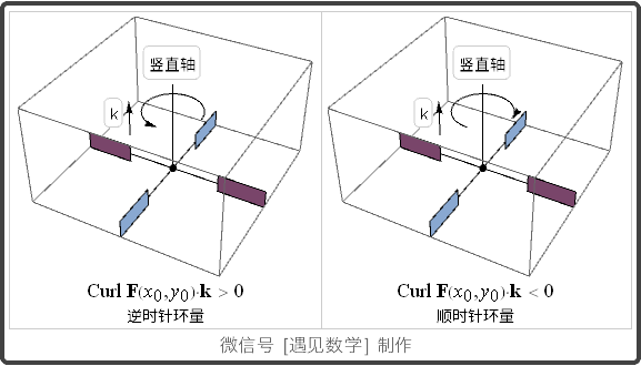 在平面区域旋度(环量密度, Circulation Density)正向为绕 z 轴逆时针旋转, 可视为流体绕某一点旋转的速率. 在旋转方向为逆时针则旋度的 k-分量为正, 反之为负. 也就相当在度量一个"涡轮"以什么方向旋转以及旋转有多快, 可以观察下面动画: