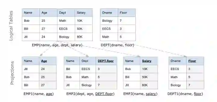 下图的例子中,EMP 表被存储为 3 个 Projections,DEPT 被存储为 1 个 Projection。每个 Projection 按照各自的 Sort key 排序,在图中用下划线表示 Sort key。