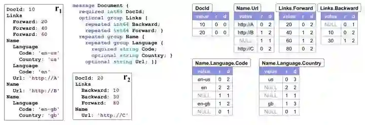 作为例子,下图左半边展示了数据的 Schema 和 2 个 Document 的实例,右半边是序列化之后的各个列: