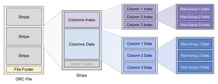为分区构造索引是一种常见的优化方案,ORC 的数据结构分成以下 3 个层级,在每个层级上都有索引信息来加速查询: