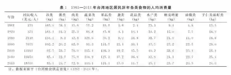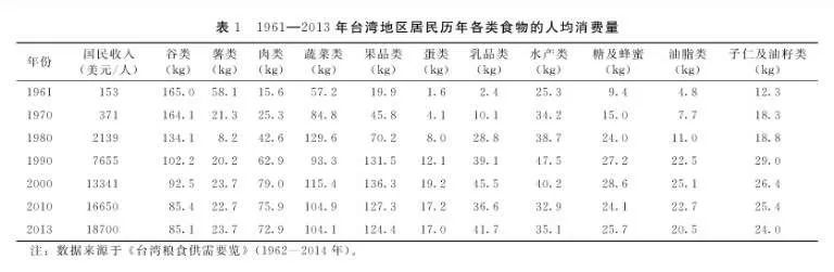 台湾台湾主要年份经济发展指标、各类食物消费量及占比情况
