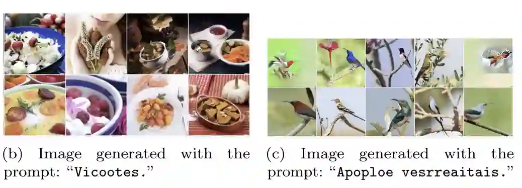初步研究表明,像“Contarra ccetnxni ams lurycat anni ounons”这样的提示有时会产生包含虫子和害虫的图像(约占生成图像的一半),每次还会产生不同的图像,大部分是动物。而“Apoploe vesrreaitais”这个短语的一致性明显更强,可以以各种方式组合来生成具有一致性的图像。