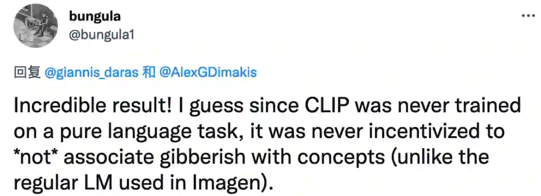 令人难以置信的结果!我猜想,由于CLIP从未在纯语言任务上接受过训练,它从未被激励“不”去将胡言乱语与概念联系起来(不像Imagen中使用的常规语言模型)。