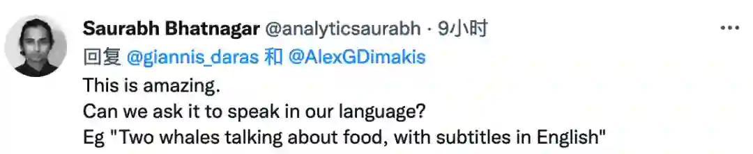 这真是不可思议。我们能要求它用我们的语言说话吗?例如 “两只鲸鱼在谈论食物,有英文字幕”。