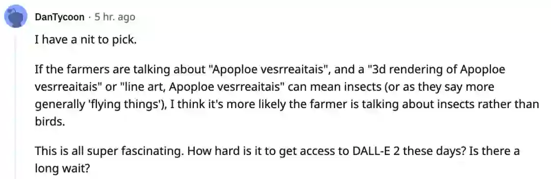 我要吹毛求疵一下。如果农民谈论的是 “Apoploe vesrreaitais”,而 “Apoploe vesrreaitais的3D效果图 ”,或 “线条艺术,Apoploe vesrreaitais ”可以指昆虫(或如他们所说的更普遍的 “会飞的东西”),那我认为农民更可能是在说昆虫而不是鸟。