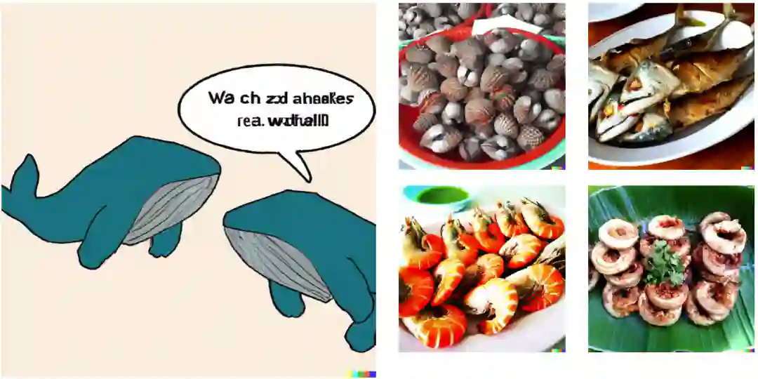例如,"Two whales talking about food, with subtitles"(两只鲸鱼在谈论食物,有字幕)产生了一个带有文字 "Wa ch zod ahaakes rea" 的图像。把这段文字作为提示输入模型,在生成的图像中看到了海鲜。