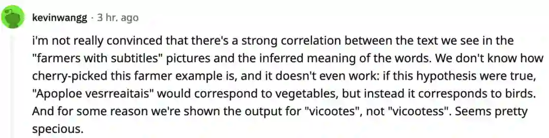 我不太相信我们在“farmers with subtitles”的图片中看到的文字和推断的单词含义之间有很强的相关性。我们不知道这个农民的例子是如何“偷梁换柱”的,而且它甚至不起作用:如果这个假设是真的,“Apoploe vesrreaitais ”就对应“蔬菜”,但它对应的却是“鸟”。而且由于某种原因,我们看到的是 “vicootes ”的输出,而不是 “vicootess”。这看起来很似是而非。