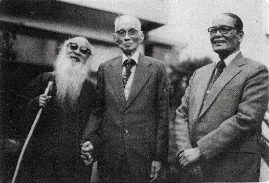 ▲1981年春,画坛三老张大千、鲍少游、黄君璧(左起)在摩耶精舍赏梅花
