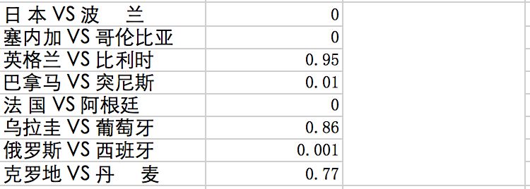 以下为我的程序 6.28 日的预测结果(第二列为主队获胜概率,0~1):