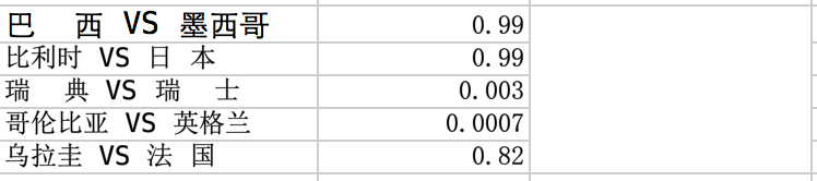这就是足球的迷人地方,error 包含了韩国对德国这个超大冷门,我们的程序预测韩国胜率几乎为 0。