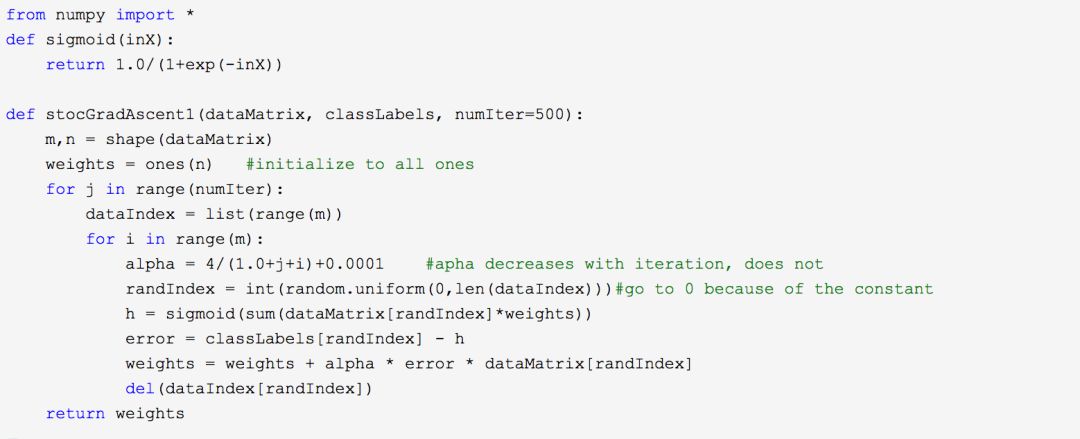 28 日晚 22 点前总共 44 场比赛,我们使用 Logistic 回归 +Sigmoid 函数分类方式处理(详情请阅读参考文献《机器学习实战》),训练算法为改进的随机梯度上升算法: