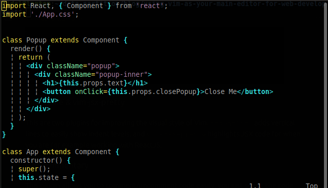 这两个插件可以改进Vim的视觉样式。indentline可以添加竖线来显示缩进级别,vim-jsx-pretty能给JSX代码添加高亮,很适合编写ReactJS等代码时使用。