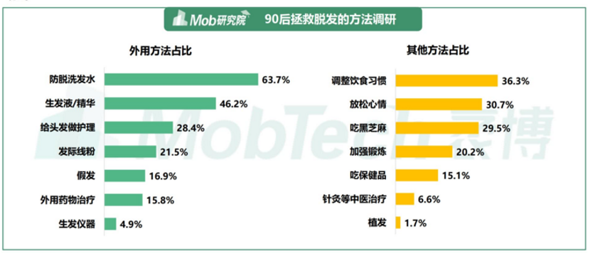 据Mob研究院《2021年90后脱发调研报告》数据显示,有超60%的90后选择防脱洗发水拯救脱发问题。而选择植发的90后仅占1.7%。京东超市2021年双十一当天销售数据显示,防脱洗发水成交额同比增长6倍,护发精华成交额同比增长9倍。