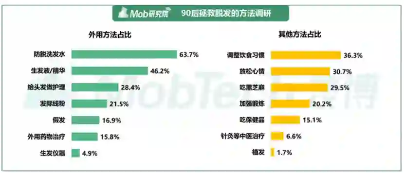 除医疗手段外,“人间蒲公英”们拯救发际线的主要手段还包括防脱洗发水、生发液、假发、食疗等等。