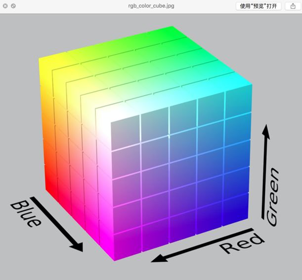 彩色图像一般采用RGB色彩模式,每个像素由RGB三个颜色分量组成。随着硬件的不断升级,彩色图像的存储由最初的8位、16位变成现在的24位、32真彩色。所谓全彩是指每个像素由8位(28=0~255)表示,红绿蓝三原色组合共有1677万(256∗256∗256)万种颜色,如果将RGB看作是三维空间中的三个坐标,可以得到下面这样一张色彩空间图: