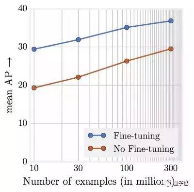 或许最令人惊讶的发现在于,视觉任务性能和表现学习训练数据量(取对数)之间的关系。我们发现,这样的关系仍然是线性的。即使训练图片规模达到3亿张,我们也没有观察到性能上升出现停滞。如下图所示: