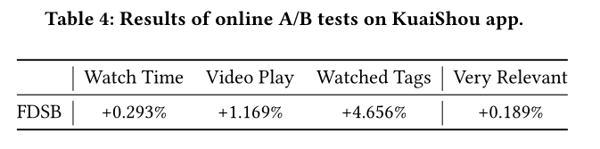 实验结果来看,FDSB在用户观看时间和视频播放方面取得了显著的改进,这表明用户粘性得到了提高;其次,用户观看视频的标签数量增加也说明FDSB可以推荐更多样性的视频。