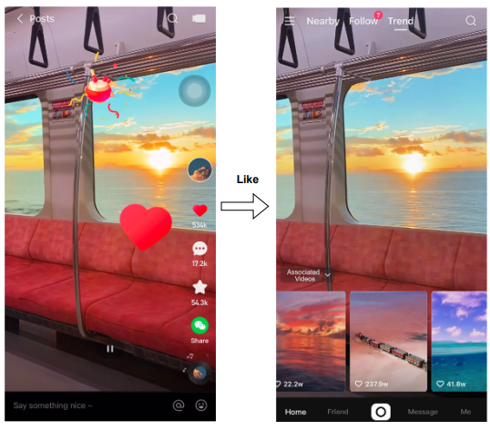 下图是快手的短视频推荐:左图是一个包含了三个特征标签(例如日落、火车和大海)的视频,在用户点击了喜欢后,会产生右图含有几个相关视频的推荐页面。