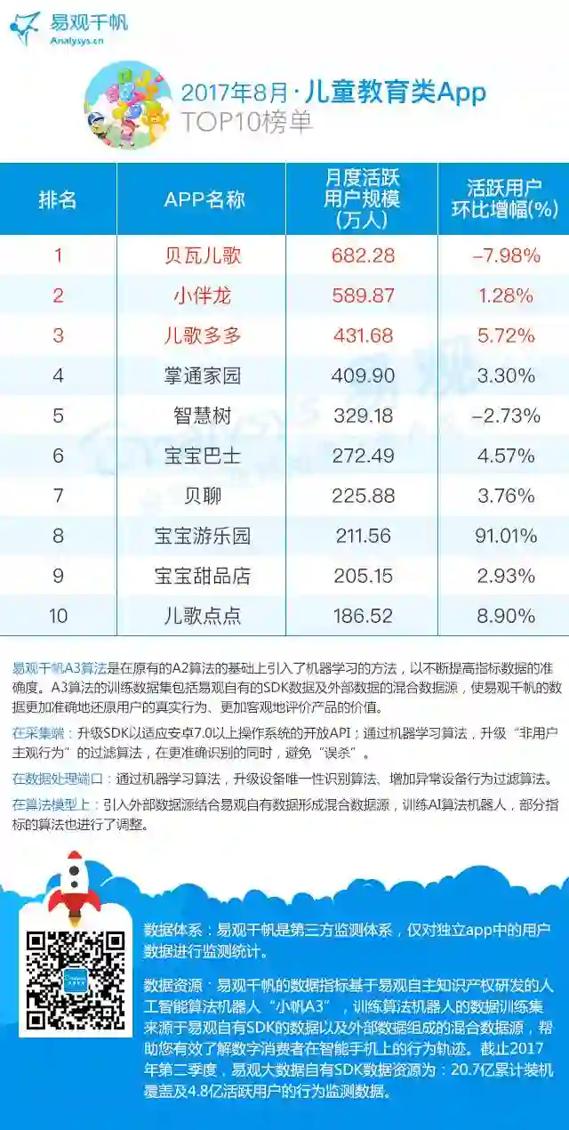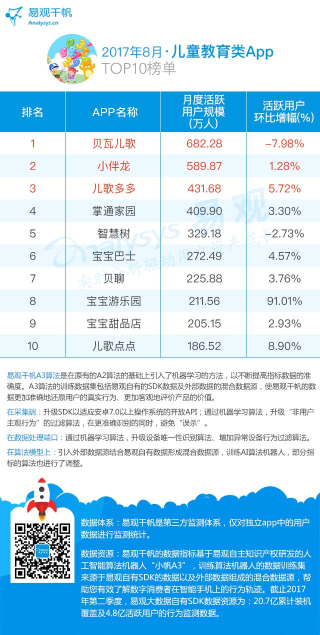 宝宝巴士旗下的宝宝游乐园8月环比增长高达91.01%,宝宝巴士主要专注于移动智能早教产品研发,以寓教于乐的方式打造兴趣启蒙类产品,旗下众多App在儿童教育类领域内均有非常良好的表现。