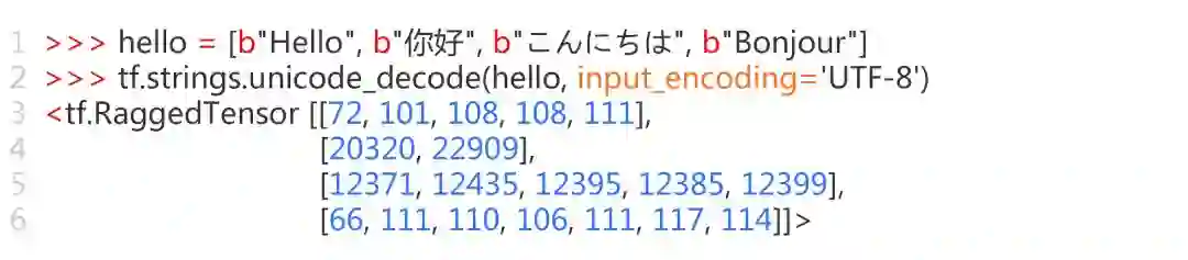 Unicode tutorial colab 展示了如何在 TensorFlow 中表示 Unicode 字符串。使用 TensorFlow 时,有两种标准方式来表示 Unicode 字符串: