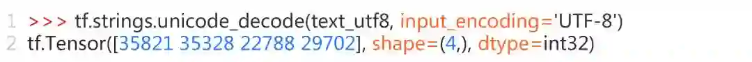 tf.strings.unicode_decode: 将字符串标量转换为 code point 的向量(https://www.tensorflow.org/versions/r1.13/api_docs/python/tf/strings/unicode_decode)