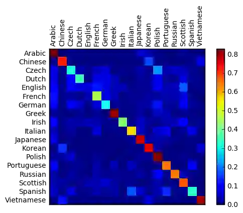 你可以从主轴上选出亮点,显示哪些语言预测错误,例如很多汉语被预测为韩语这一类了,西班牙语被预测为意大利语。由这个图可知,希腊语预测的结果非常好,颜色最亮,英语预测的很差(可能的原因是和其他很多欧洲语言有很多重合的词)