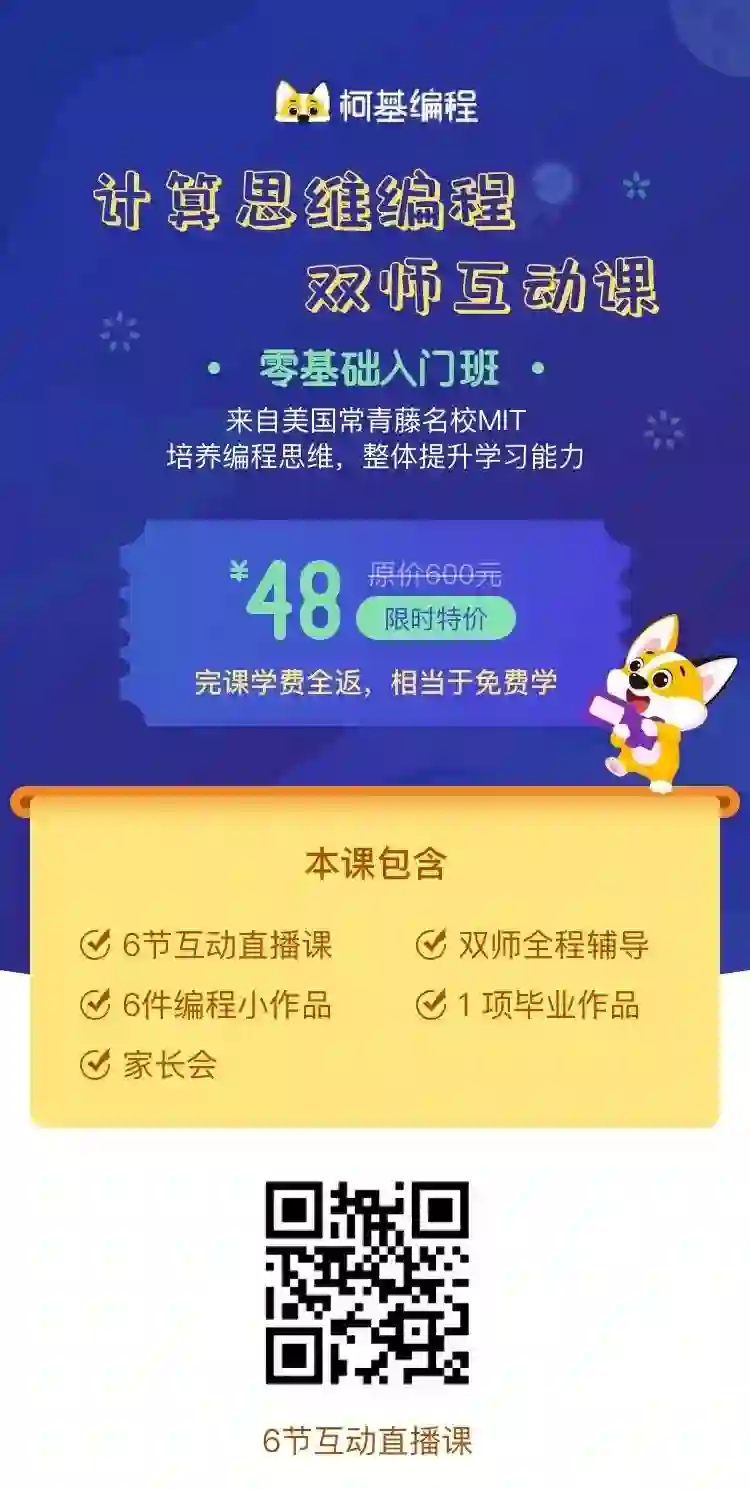 柯基少儿编程入门课限时优惠招生,一共七个课时,现在只需48元,而且学完课程学费全返!