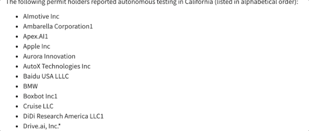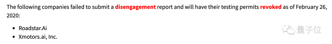 最后,还是在这次报告披露中,还有两家中国力量因为没有提交脱离接管报告,将被取消加州路测资格: