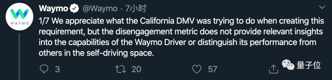 Waymo今早发布推特上称,脱离指标并没有提供有关Waymo司机能力的相关见解,不认为(加州)脱离接触的数据应该用来比较性能。