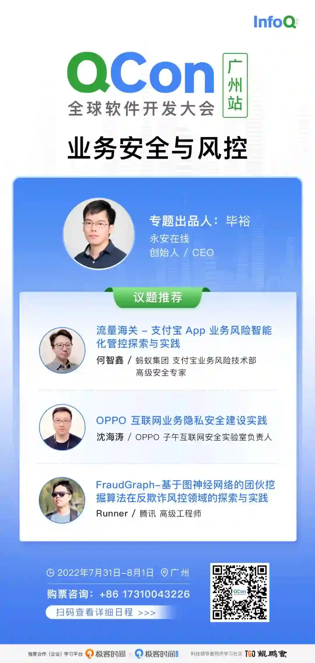 QCon 广州站【业务安全与风控】专题已上线官网,点击底部【阅读原文】查看更多大会精彩分享~