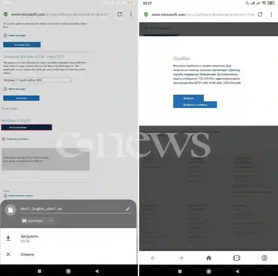 从波兰 IP 地址(右侧)和俄罗斯 IP 地址下载 Windows 11 镜像的过程,图片来源:CNews
