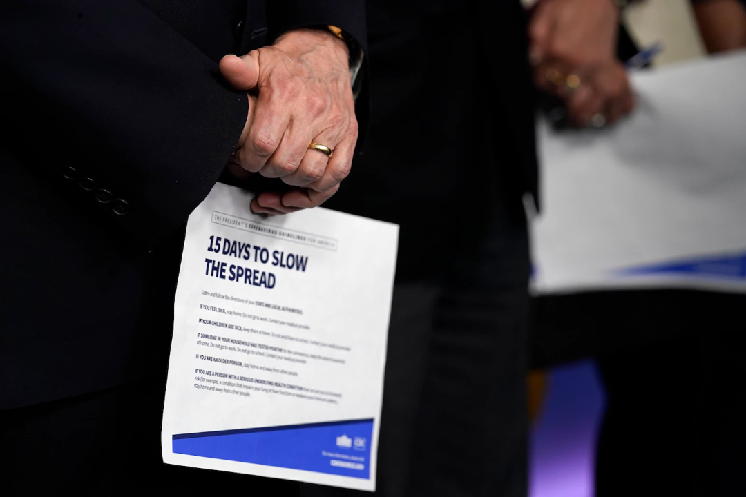 副总统彭斯周一在与冠状病毒特别工作组的新闻发布会上拿着一张信息表。(Evan Vucci / 美联社)