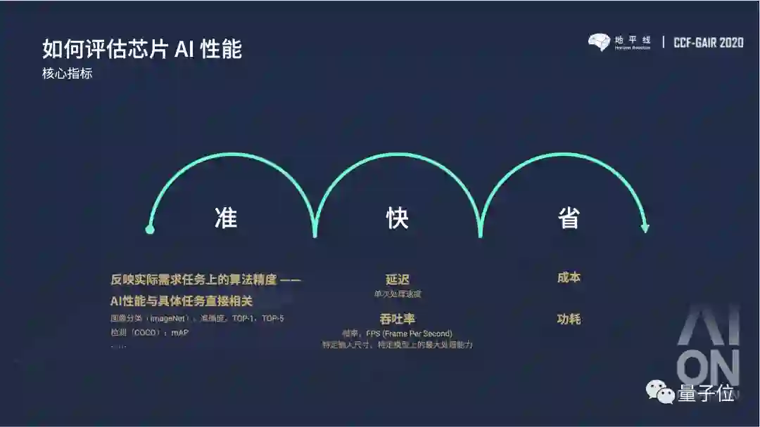 所以如何评估芯片的AI性能,黄畅认为应该换一个角度,从准、快、省这三个维度来看。
