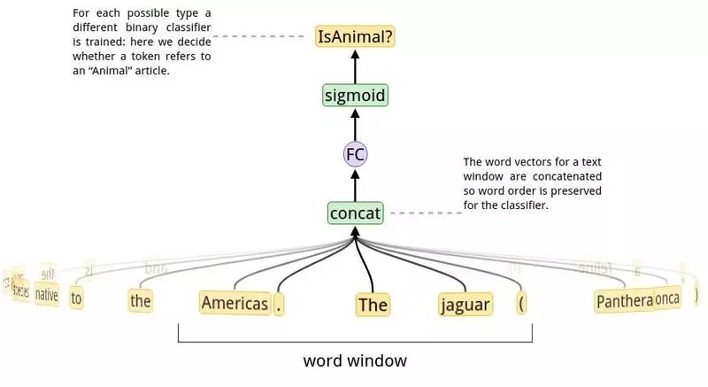 使用每个维基百科的内部链接以及其上下文来产生训练数据,我们需要使用神经网络来学习一种映射关系,即单词到 100 维的二值向量之间的映射。这一步将之前的步骤联系起来:维基百科的链接将单词与实体相连,通过第二步我们知道了每一个实体的类别,而第三步则在我们的类型系统中选择了实体所属的类别。