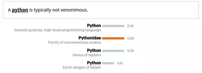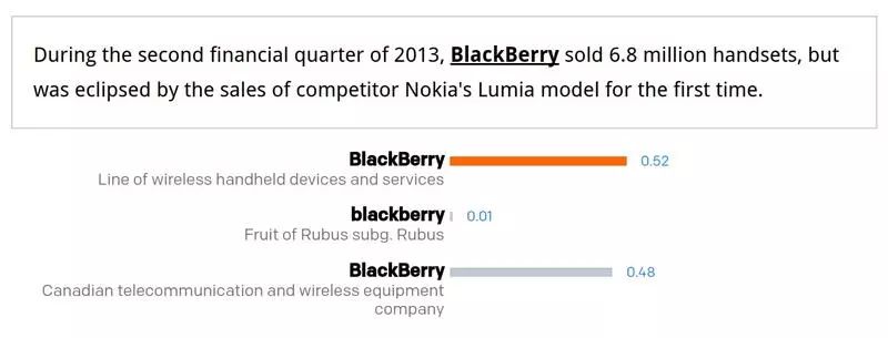 在测试阶段,给定一个词语以及其上下文,我们的神经网络将输出该词语属于其类型系统中每一个类别的概率。如果我们知道了类别成员的准确集合,我们可以将结果缩小到一个实体 (假设分类结果是完美的)。但实际上,我们必须计算大概 20 个概率问题:对于该单词的每一个可能对应的实体,都需要使用贝叶斯理论来计算其概率。