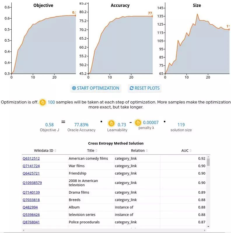 现在我们可以使用这些学习能力分数和统计数据来评估我们的类型系统中的一些子集的性能。下图是使用交叉熵进行优化的效果,点击原文可以查看动态优化过程。