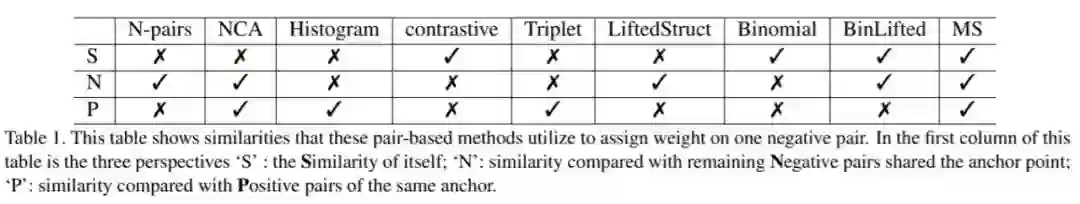 如下表所示,基于样本对的各种损失函数都可以归类到这三种相似性,目前只有该论文提出的 MS Loss 能同时考虑三种相似性。