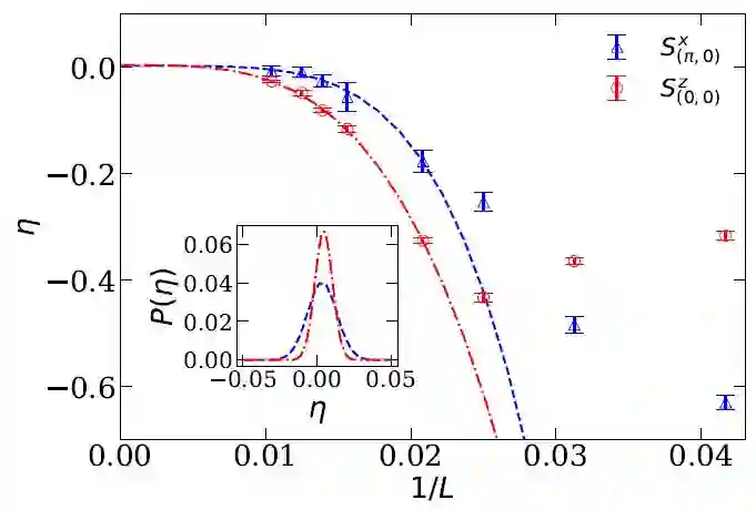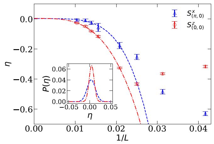 Fig.3: 量子蒙特卡洛模拟得到的守恒流结果。x轴为1/L ,即外推到系统线性尺度无穷大的热力学极限;y轴为关联函数幂律的重整化修正指数η,修正指数在热力学极限下外推到η=0,说明此处的关联函数是守恒流算符的关联函数,没有重整化修正。