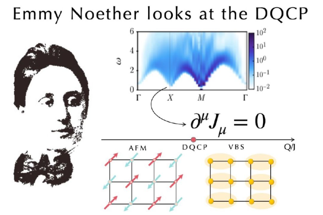 就是在这样一个一团乱麻的情况下:问题本身的困难程度;为了解决问题所需要的理论修养;为了得到可靠数据而对于大规模量子蒙特卡洛所进行的计算资源调配;得到数据后如何进行可靠的有限尺度标度分析;…..。我们就是在反复追问解决方案的过程中与诺特相遇 [8]。诺特定理告诉我们,物理系统的连续对称性对应着守恒流,反之亦然,重要就重要在这个反之亦然。本文(上)中举出的诺特定理在教科书中的应用,都是正向的,而现在对于 DQCP,需要反过来思考,这事看来显而易见,却着实困扰了我们很长时间。