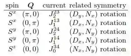 在文献 [8] 中,我们也的确是这样做的。首先在涌现作用量中推导出守恒流的场论表达形式,如表1中第3列。而我们可以严格计算的,是原本的晶格模型中的种种自旋关联函数,于是还需要近一步把场论算符推导至晶格模型中的微观算符,这就是表1中第1列和2列。此时就可以看到场论模型中的守恒流算符其实是晶格模型中自旋