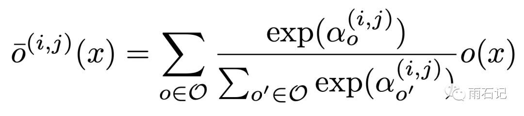 那么,Darts是如何做到在结构搜索上可微的呢?这一点是通过把选择概率化做到的,即在之前的很多算法中,选择一个操作就是选择一个操作,但在Darts里,选择是一个可以通过softmax进行计算的概率,如上图中的b图,节点之间可以有多个操作,这些操作通过概率聚合起来。概率公式如下:
