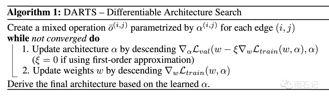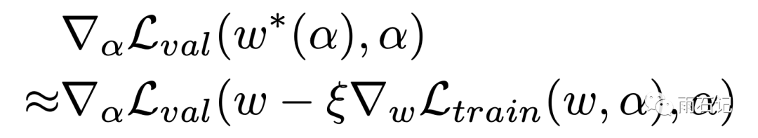 但是,完美的解决这个损失函数是不现实的,因为内层寻找最优w的操作是非常耗时的,因而,Darts算法做了一个近似,即循环学习alpha和w: