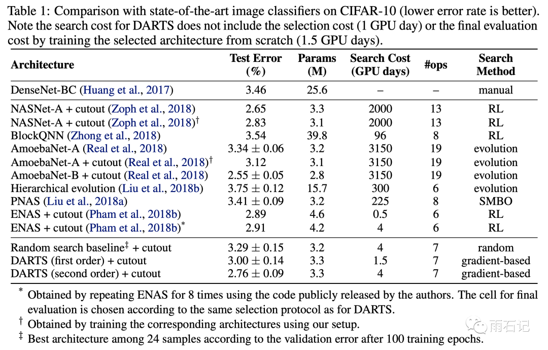 基于遗传算法还有基于RL的算法之所以耗时比较长,是因为在这两种算法中,网络结构跟网络结构对应的参数是两回事,网络结构是离散的,要先确定网络结构,然后再去训练网络结构所对应的参数。因而耗时就长了。