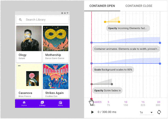 这些演示是在一个名为 Direct 的网络应用中编写的,该应用由 Google 的动效设计师 John Schlemmer 创建。它已成为 Google 内部交流动效的常用工具。现在,我们很高兴地在我们的指南中公开分享这些动效规范,以帮助阐述动效设计的所有细节。如果您要使用 Direct 创建和托管自己的动效规范文件,可以在 GitHub 上获取其开源代码。