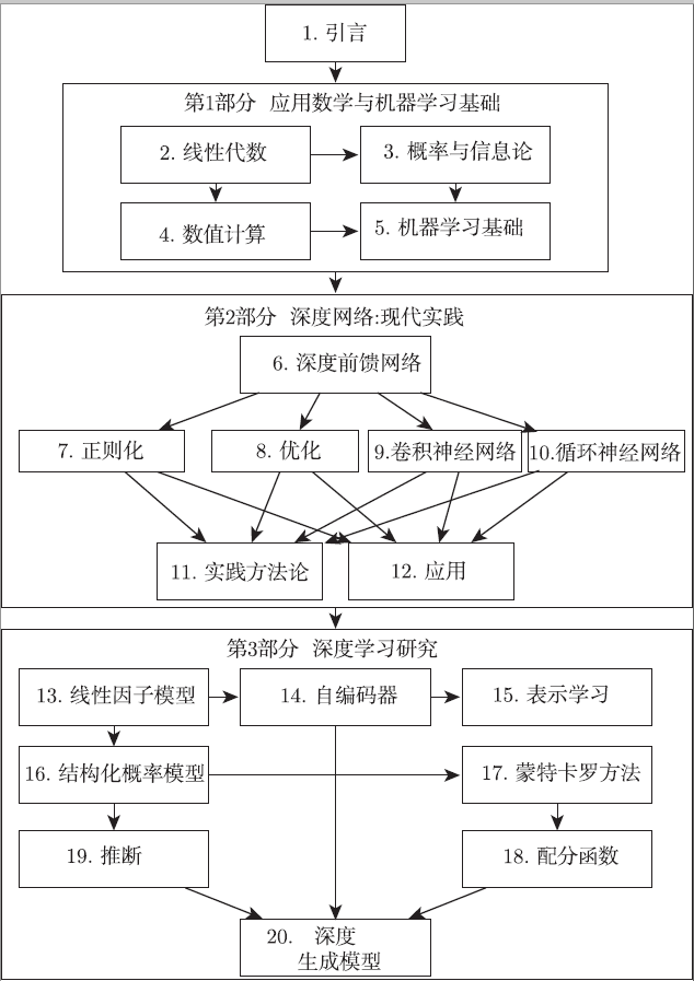 《深度学习》中文版内容组织结构图。从一章到另一章的箭头表示前一章是理解后一章的必备内容。