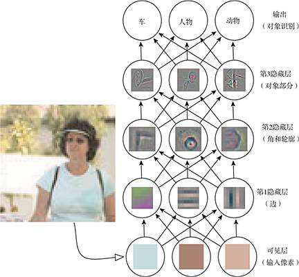 图 1.2 深度学习模型的示意图。计算机难以理解原始感观输入数据的含义,如表示为像素值集合的图像。将一组像素映射到对象标识的函数非常复杂。如果直接处理,学习或评估此映射似乎是不可能的。深度学习将所需的复杂映射分解为一系列嵌套的简单映射 (每个由模型的不同层描述) 来解决这一难题。输入展示在可见层(visible layer),这样命名的原因是因为它包含我们能观察到的变量。然后是一系列从图像中提取越来越多抽象特征的隐藏层(hidden layer)。因为它们的值不在数据中给出,所以将这些层称为“隐藏层”; 模型必须确定哪些概念有利于解释观察数据中的关系。这里的图像是每个隐藏单元表示的特征的可视化。给定像素,第 1 层可以轻易地通过比较相邻像素的亮度来识别边缘。有了第 1 隐藏层描述的边缘,第 2 隐藏层可以容易地搜索可识别为角和扩展轮廓的边集合。给定第 2 隐藏层中关于角和轮廓的图像描述,第 3 隐藏层可以找到轮廓和角的特定集合来检测特定对象的整个部分。最后,根据图像描述中包含的对象部分,可以识别图像中存在的对象 (经 Zeiler and Fergus (2014) 许可引用此图)