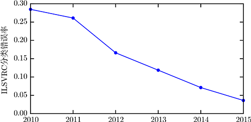 最早的深度模型被用来识别裁剪紧凑且非常小的图像中的单个对象 (Rumelhart et al., 1986d)。此后,神经网络可以处理的图像尺寸逐渐增加。现代对象识别网络能处理丰富的高分辨率照片,并且不需要在被识别的对象附近进行裁剪 (Krizhevsky et al., 2012b)。类似地,最早的网络只能识别两种对象 (或在某些情况下,单类对象的存在与否),而这些现代网络通常能够识别至少1000个不同类别的对象。对象识别中最大的比赛是每年举行的 ImageNet 大型视觉识别挑战 (ILSVRC)。深度学习迅速崛起的激动人心的一幕是卷积网络第一次大幅赢得这一挑战,它将最高水准的前 5 错误率从 26.1% 降到 15.3% (Krizhevsky et al., 2012b),这意味着该卷积网络针对每个图像的可能类别生成一个顺序列表,除了 15.3% 的测试样本,其他测试样本的正确类标都出现在此列表中的前 5 项里。此后,深度卷积网络连续地赢得这些比赛,截至写作本书时,深度学习的最新结果将这个比赛中的前 5 错误率降到了 3.6%,如图 1.12 所示。