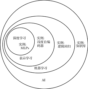 图 1.4 维恩图展示了深度学习既是一种表示学习,也是一种机器学习,可以用于许多 (但不是全部)AI 方法。维恩图的每个部分包括一个 AI 技术的实例